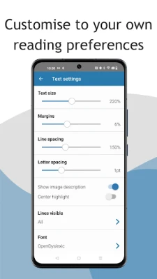 Personalizarea se află în centrul experienței EasyReader, oferind o flexibilitate inegalabilă. Aveți libertatea de a descărca simultan până la zece titluri și de a personaliza complet aspectul vizual. Pentru cititorii cu dislexie sau sindrom Irlen, aplicația oferă fonturi special adaptate, ajustări personalizate pentru culorile textului, fundalului și evidențierii cuvintelor, precum și modificări ale spațierii dintre litere, rânduri și modurilor de vizualizare, maximizând confortul. Persoanele cu deficiențe de vedere beneficiază de dimensiuni ajustabile ale textului prin gesturi tactile, contraste de culoare personalizabile și suport complet pentru afișaje braille, inclusiv un mod de citire liniară optimizat. În plus, funcția avansată de Text-to-Speech (TTS) transformă cărțile și ziarele în audio cu voci sintetizate, de o calitate excepțională, permițând ajustarea ritmului, volumului și pronunției, alături de o citire sincronizată ce evidențiază textul pe ecran.