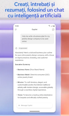 Microsoft 365 Copilot este asistentul tău AI de productivitate pentru muncă și viața personală. Discută cu AI, creează și editează conținut, scanează documente, gestionează proiecte și găsește fișiere rapid. Realizează mai multe, fără efort, dintr-un singur loc.