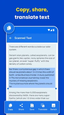 Dar capacitățile OCR Image to Text Scanner merg mai departe de simpla extragere. Odată ce ai transformat imaginea în text, poți beneficia de o funcție de traducere lingvistică direct în aplicație. Traduce instantaneu cuvintele extrase în orice limbă dorești, eliminând barierele de comunicare fără a părăsi aplicația. Acest scaner mobil, dezvoltat de Photo Scanner For Android, este partenerul tău fidel, fie că ești student, profesionist sau pur și simplu ai nevoie de digitalizare rapidă. Gestionează volume mari de documente și imagini cu ușurință, bucurându-te de eficiență, acuratețe și o experiență de lucru fără întreruperi. OCR Image to Text Scanner îți transformă fluxul de lucru, oferind o soluție completă pentru managementul textului digital.