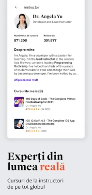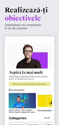 Beneficiază de expertiza unor profesioniști de top, învățând de la surse autentice într-o gamă vastă de discipline, de la inovații tehnologice și strategii de afaceri, până la gândire creativă și dezvoltare personală. Grație recomandărilor inteligente, bazate pe inteligența artificială, și a formatelor flexibile de studiu, Udemy integrează armonios procesul de învățare în ritmul tău cotidian. Astfel, transformă dezvoltarea competențelor dintr-o obligație într-o componentă firească și valoroasă a rutinei tale zilnice, permițându-ți să progresezi constant.