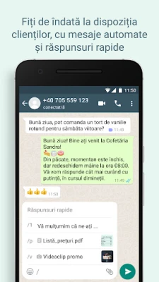 Descoperiți un set de funcționalități concepute să vă economisiască timp prețios și să optimizeze interacțiunile. Răspunsurile rapide automate și mesajele personalizate pentru momentele în care nu sunteți disponibil asigură că nicio oportunitate nu este ratată. Organizați-vă discuțiile esențiale cu etichete intuitive, permițându-vă să filtrați și să găsiți informațiile relevante instantaneu. Partajați noutăți și oferte speciale prin intermediul funcției de Stare și chiar facilitați procesul de comandă și plată direct în aplicație, oferind clienților o experiență de cumpărături fluidă și modernă.