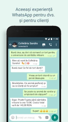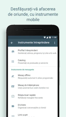 Descoperiți WhatsApp Business, aplicația care combină funcționalitățile îndrăgite de la WhatsApp cu instrumente esențiale pentru afaceri. Lucrați mai inteligent, construiți încredere și extindeți-vă compania prin mesagerie eficientă, răspunsuri automate și organizare cu etichete. Îmbunătățiți-vă comunicarea cu clienții.